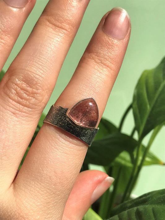 Strawberry Quartz and Sterling Silver Textured Ring with Wavy Details - UK Size N