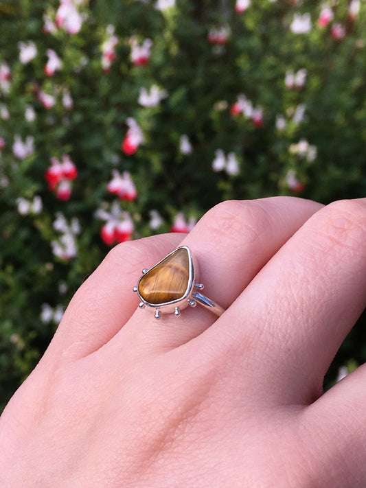 Leche De Tigre Ring - Tiger's Eye and Sterling Silver Statement Stacking Ring with Granulation Details