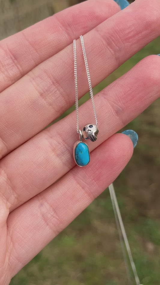 Turquoise, Black Sapphire Skull and Sterling Silver Pendant Necklace