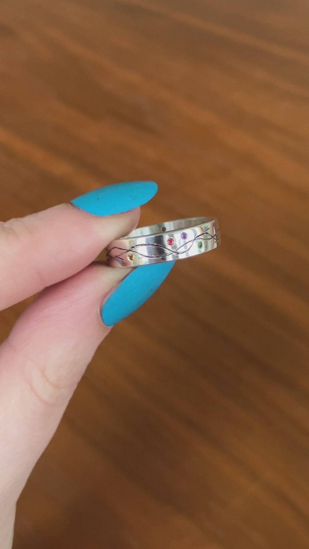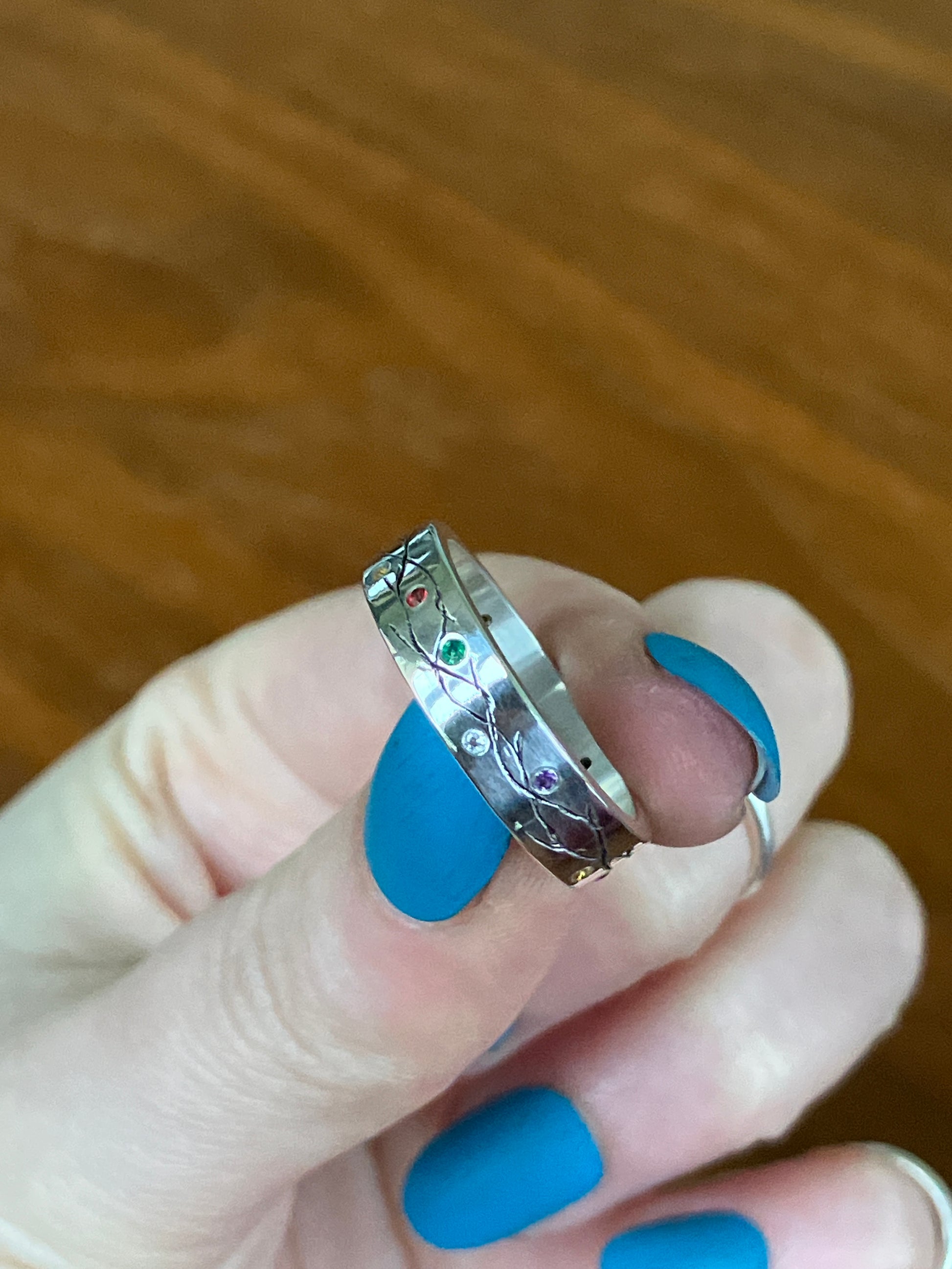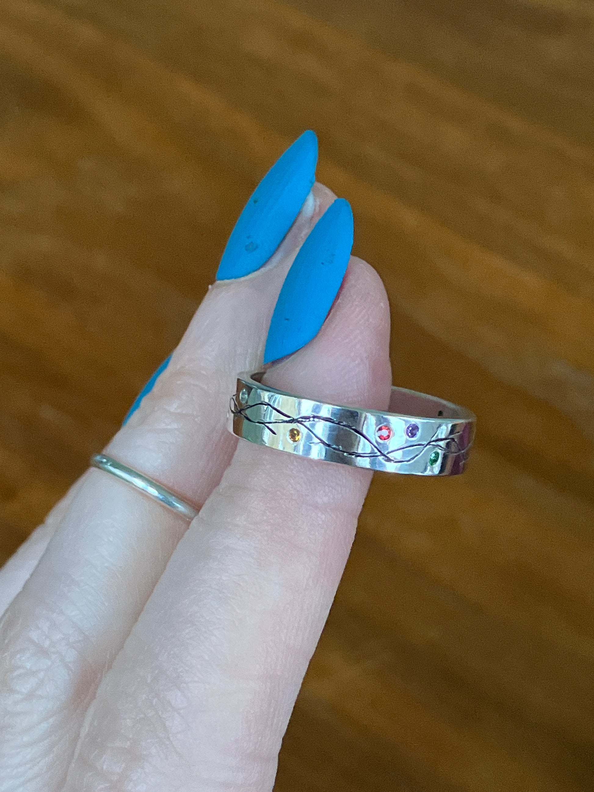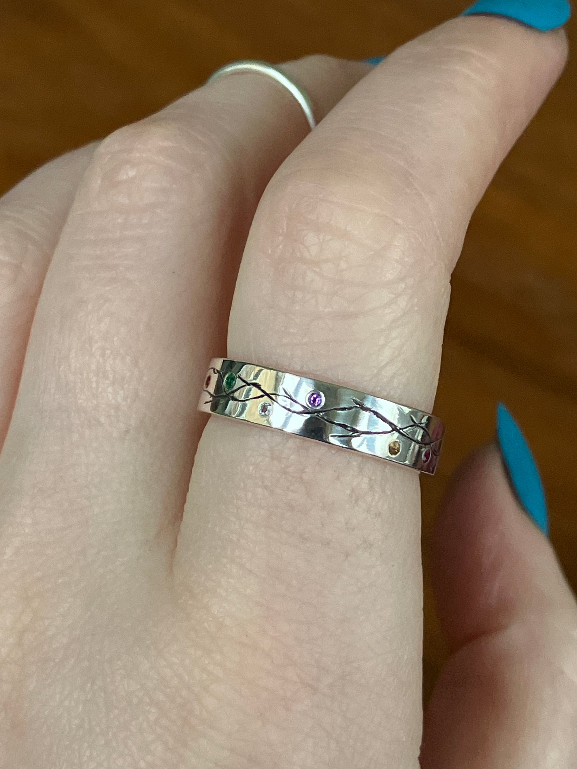 This ring features flush set Amethyst (purple), Ruby (red/pink), Emerald (green), Sapphire (orange), Citrine (yellow), Topaz (white) and Garnet (green) in a Sterling Silver band with hand textured detailing.