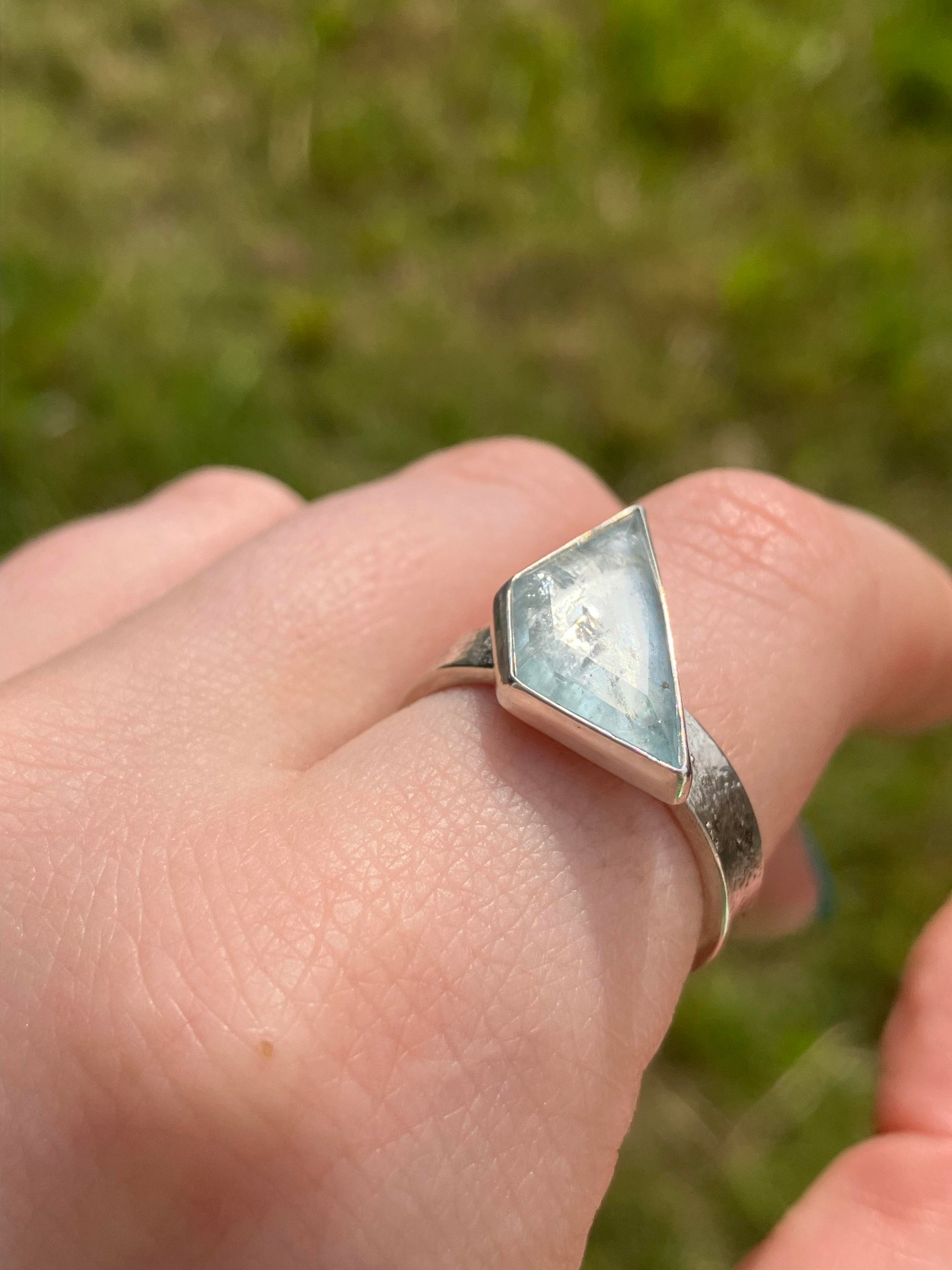 This ring features a Fine Silver bezel set Aquamarine on a recycled, textured Sterling Silver ring band.