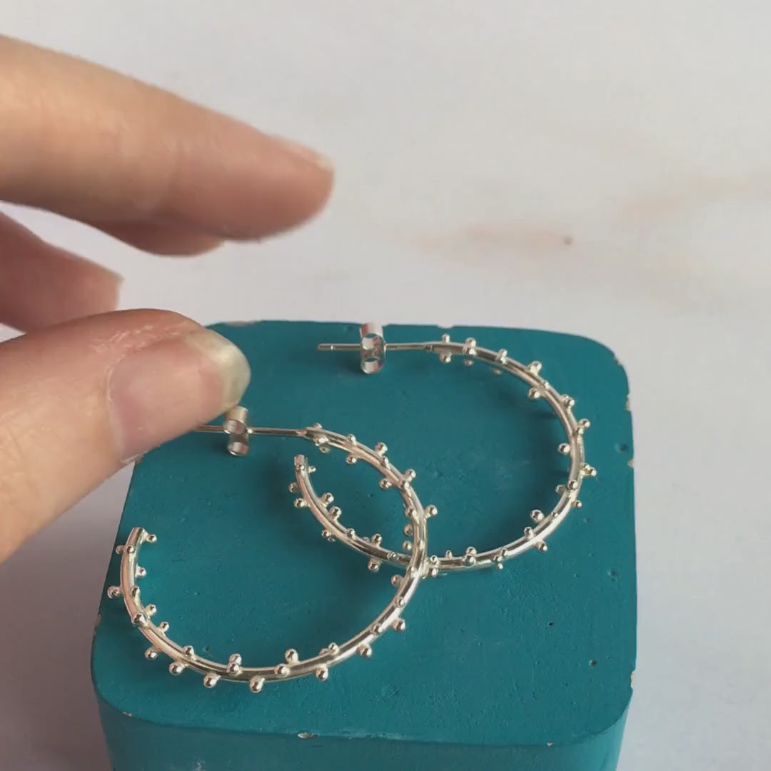 Big Sterling Silver Hoops with Granulation and Stud Closure