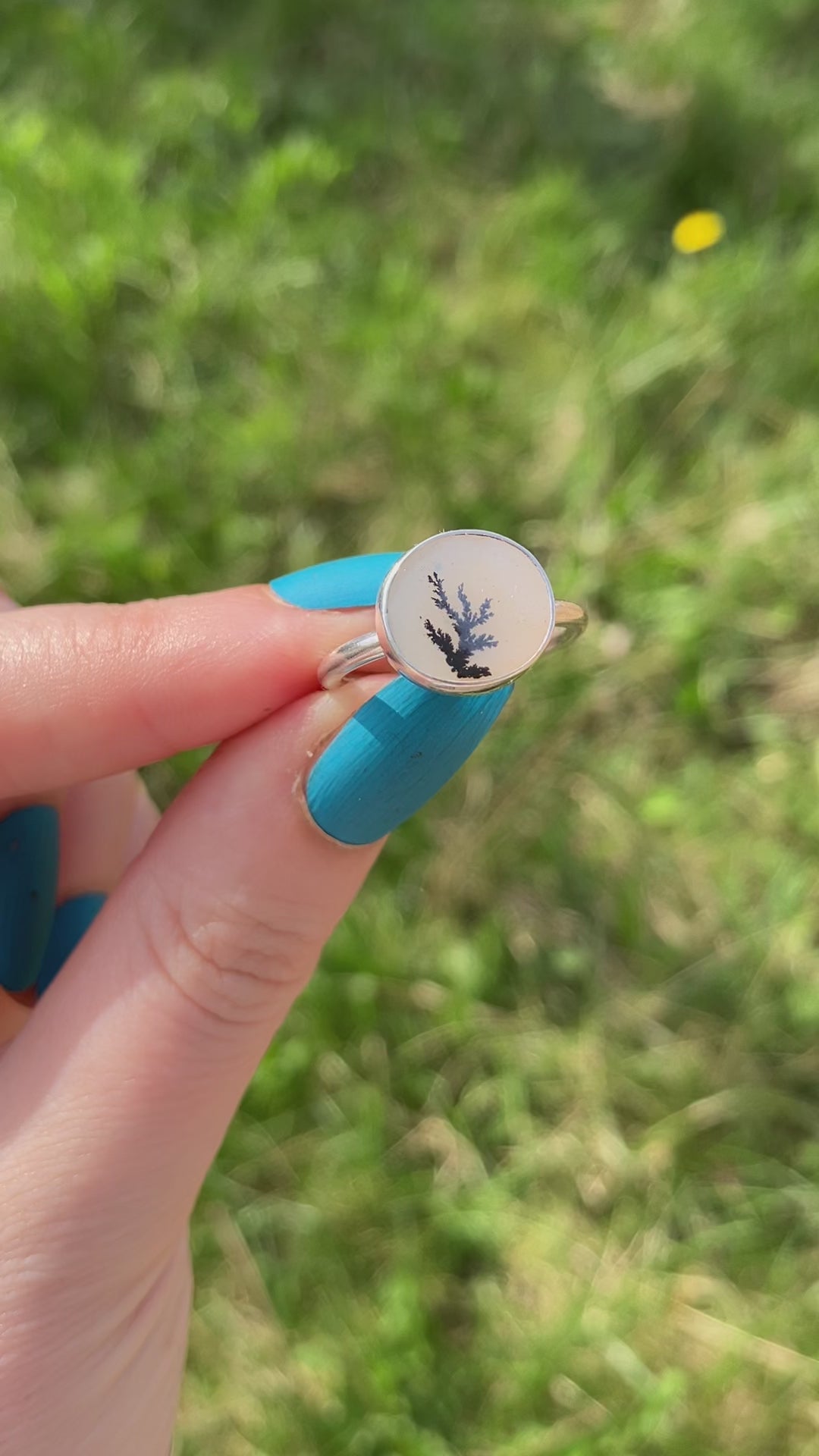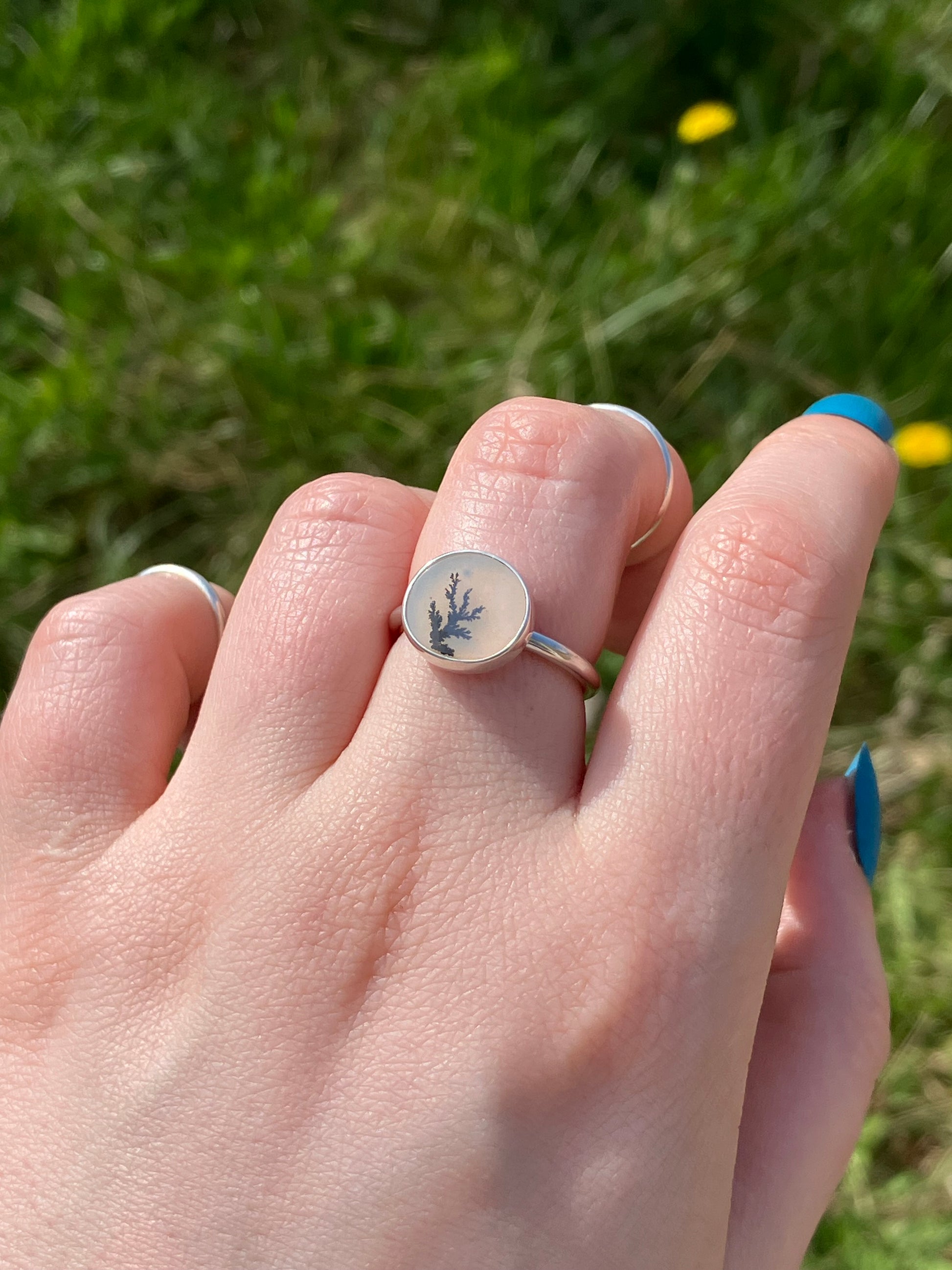 This ring features a Fine Silver bezel set Dendritic Agate on a recycled Sterling Silver ring band.
