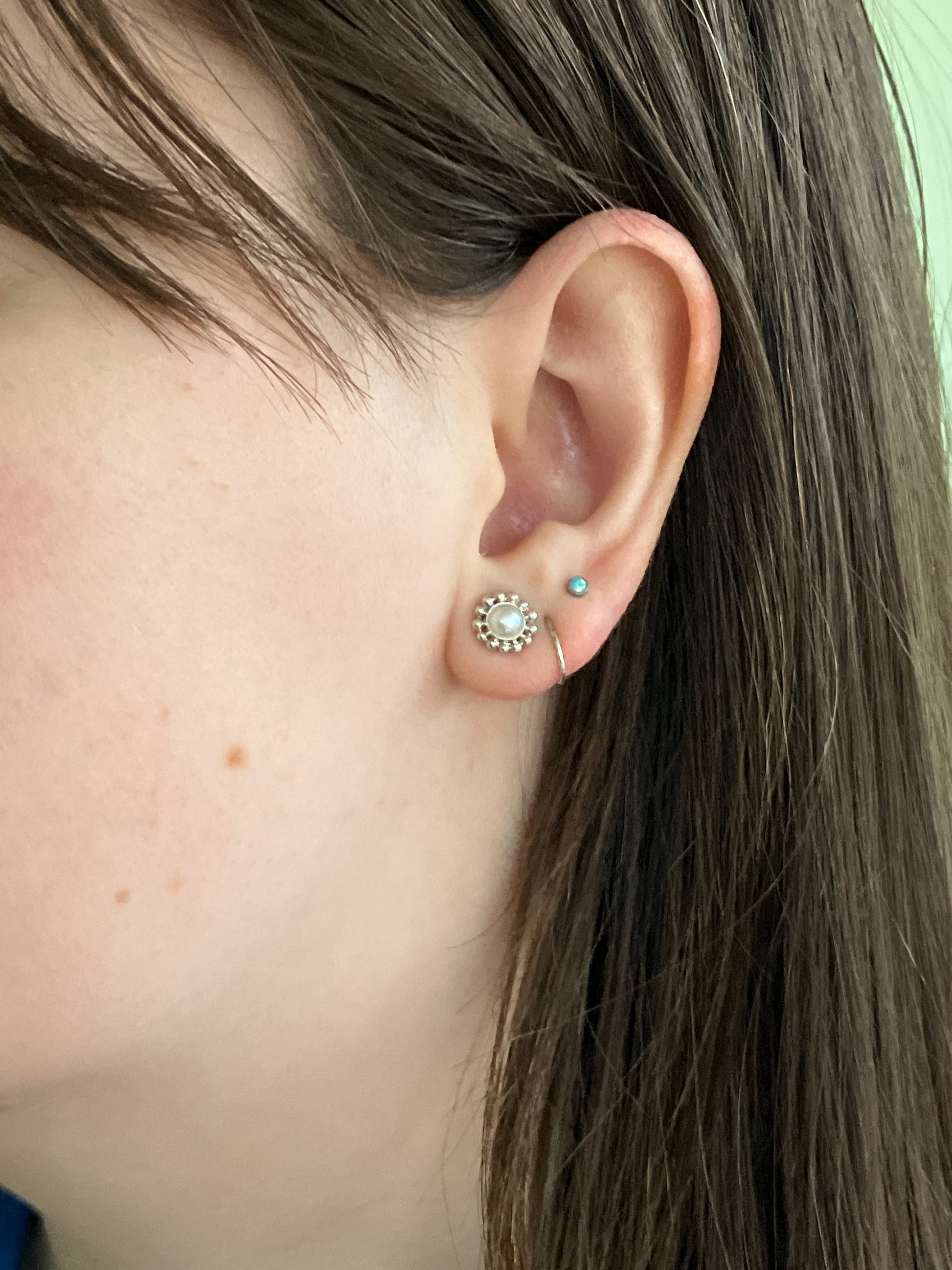 These earrings feature Fine Silver bezel set Freshwater Pearls with Sterling Silver granulation details.