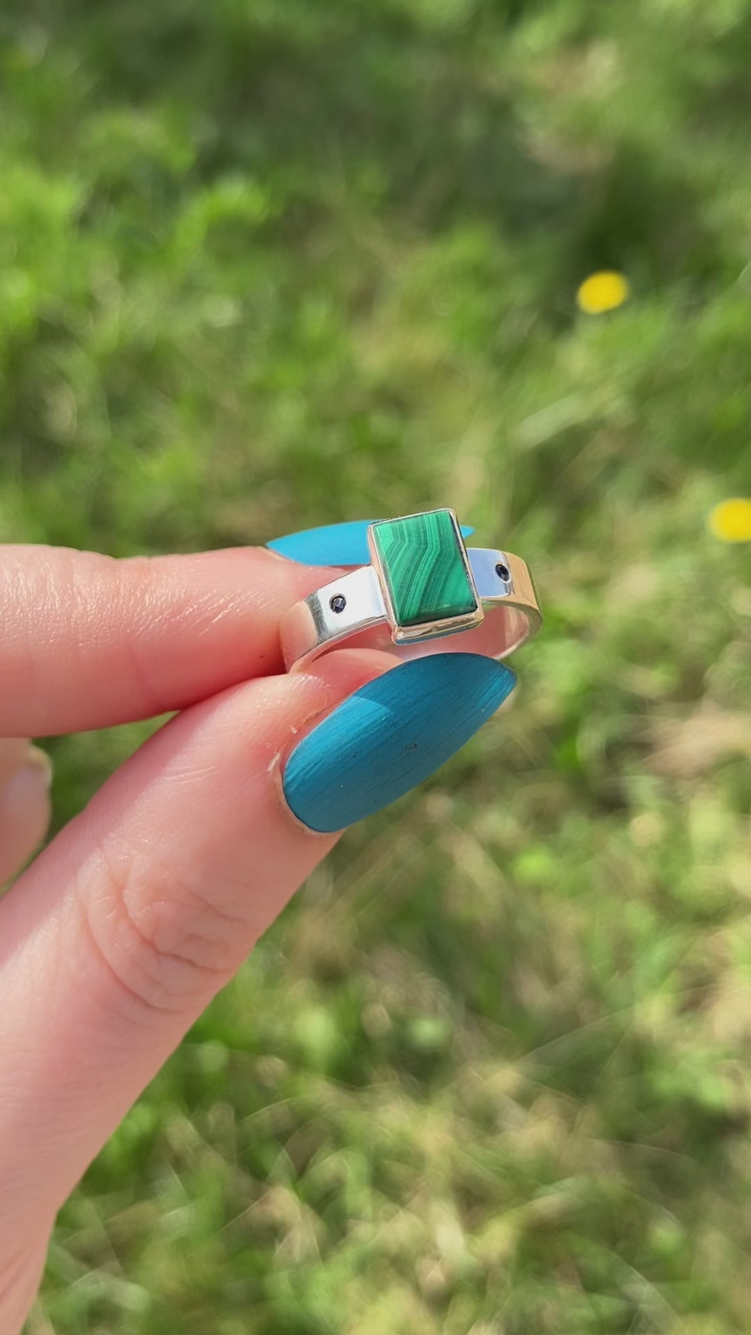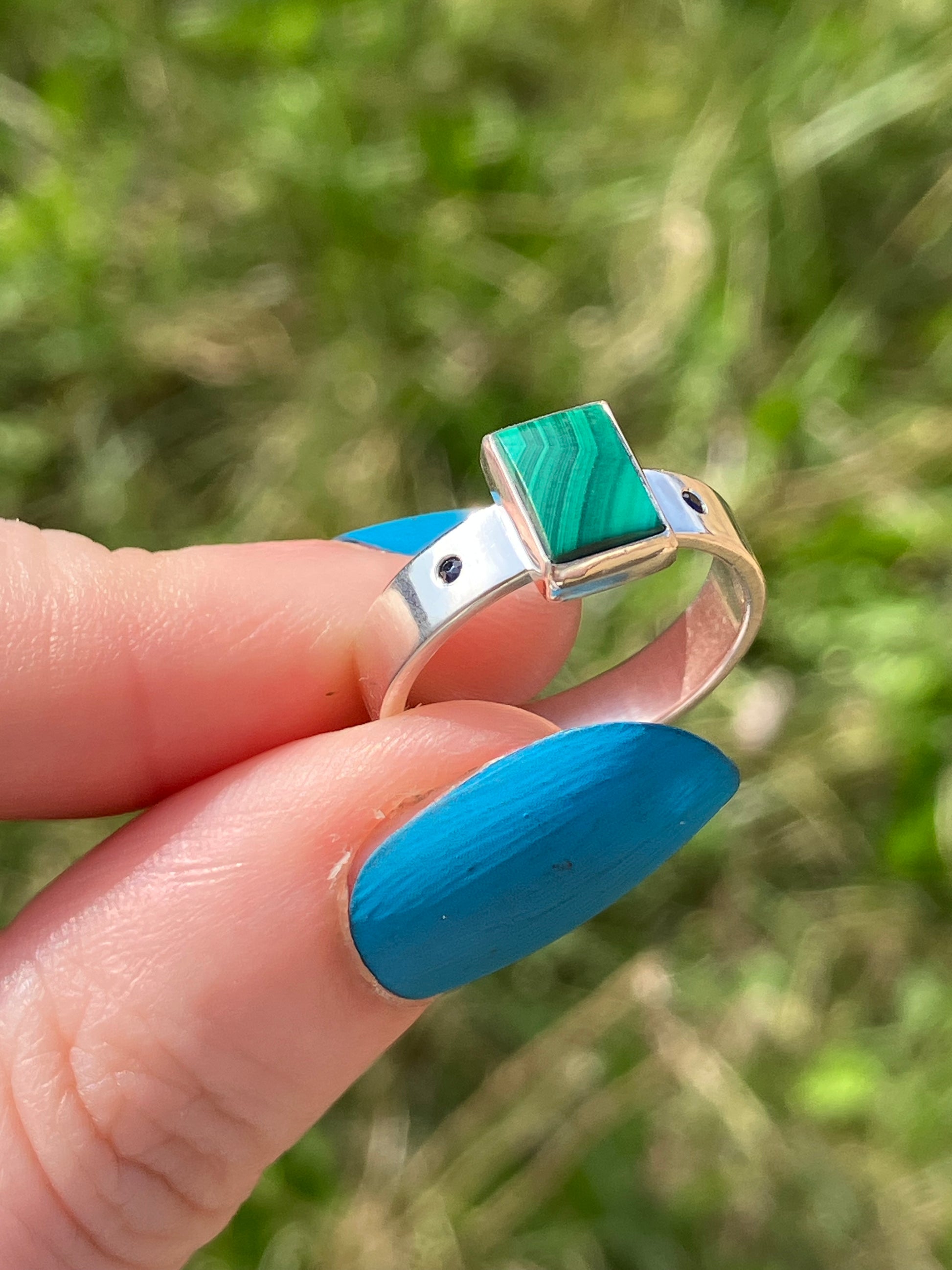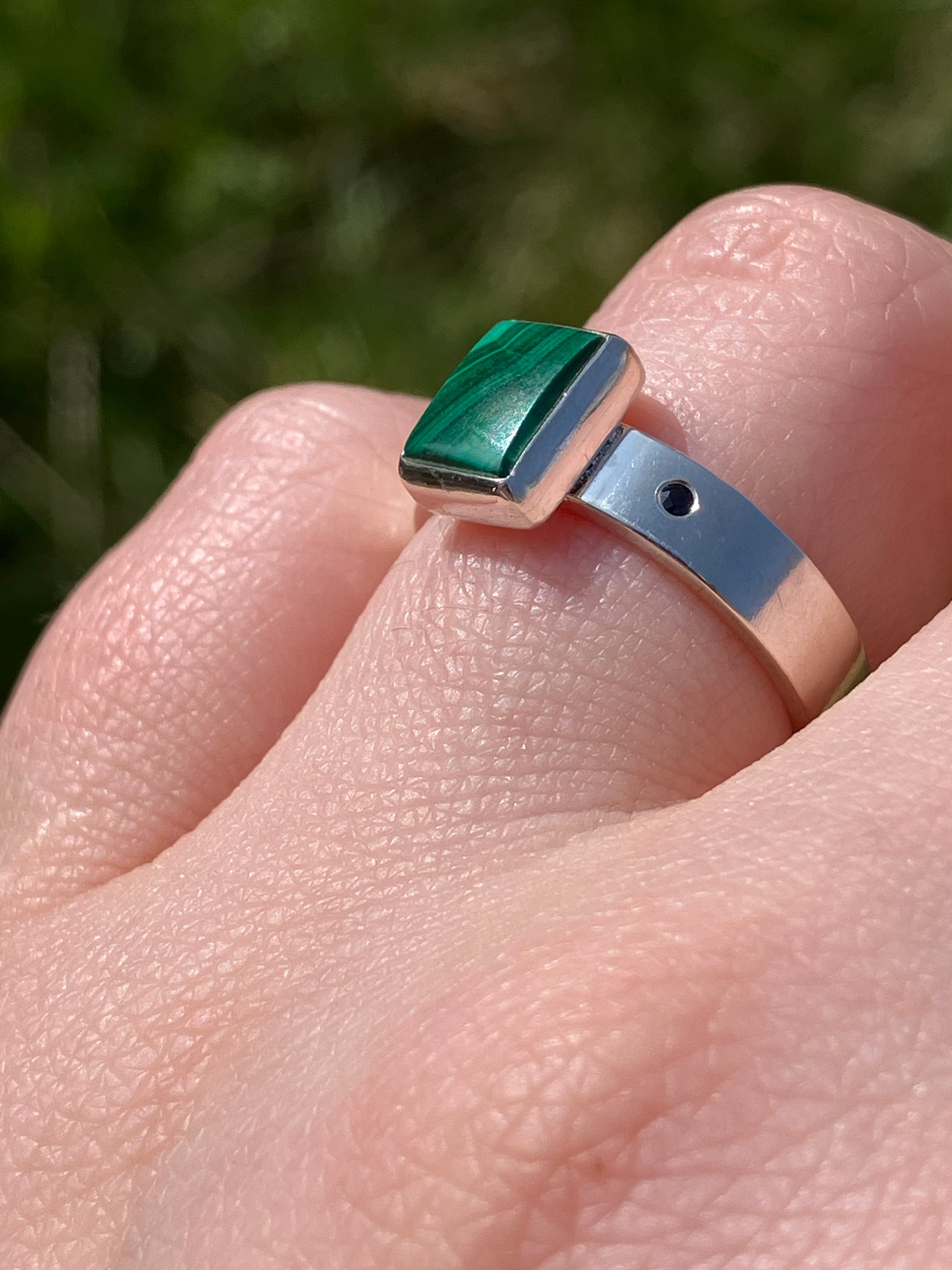 This ring features a Fine Silver bezel set Malachite with 2 Black Sapphires flush set into the Sterling Silver band.