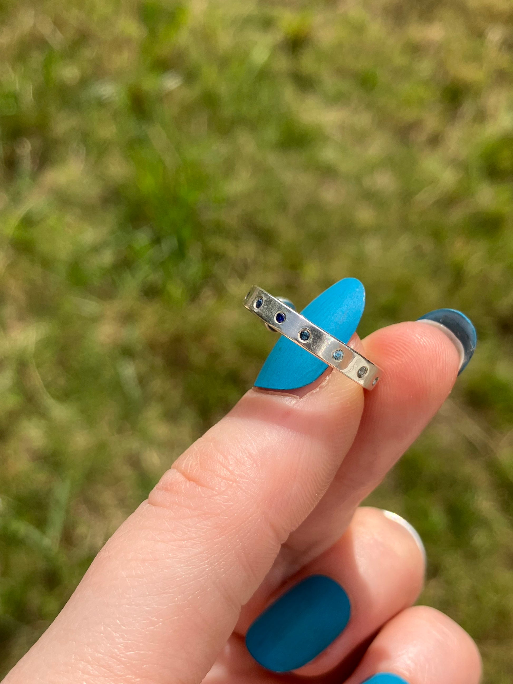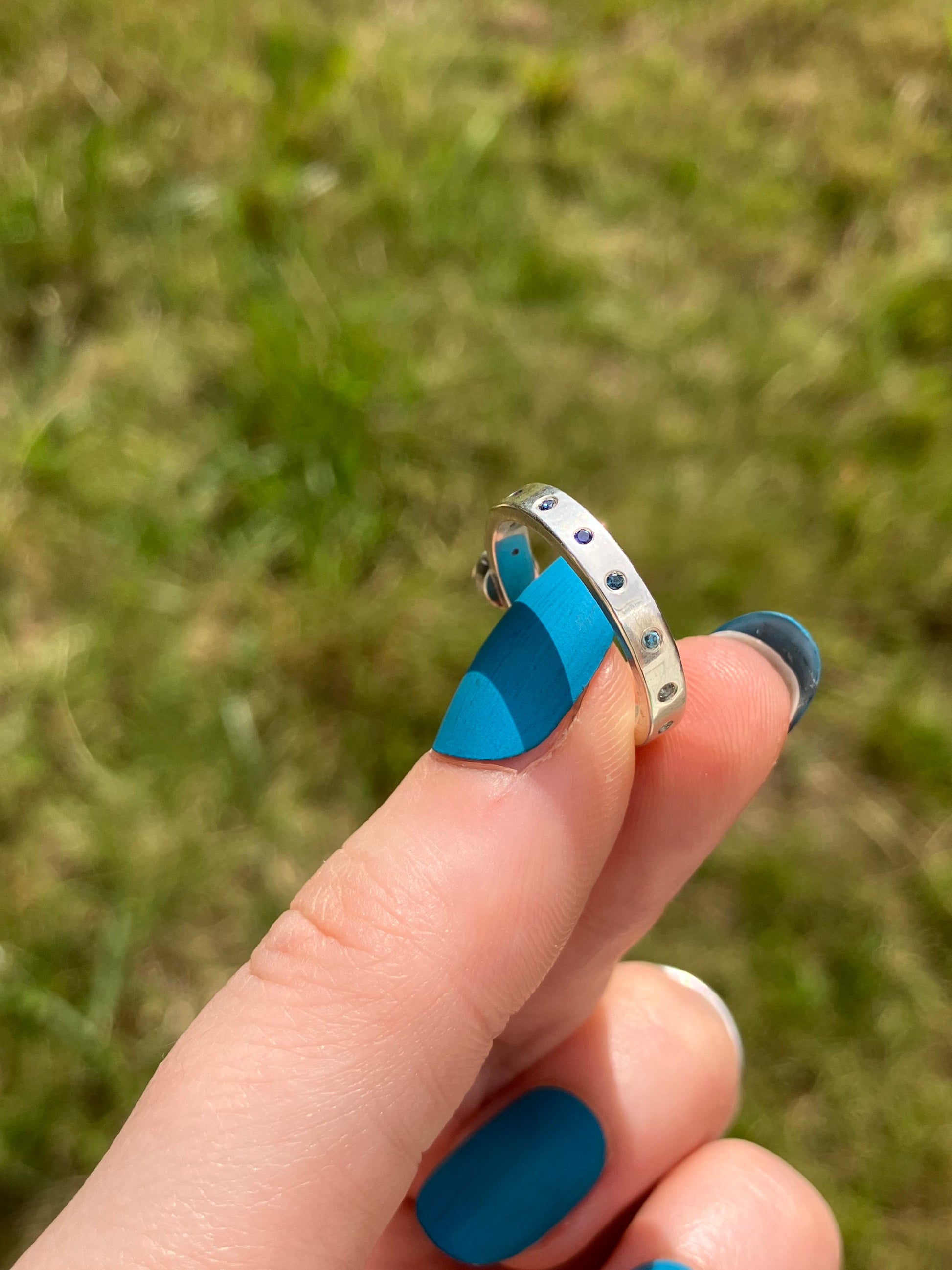 This ring features flush set Peridot, Emerald, Green Sapphire, Tsavorite, Topaz, Sapphire, Alexandrite, Iolite and Amethyst in a Green to Blue to Purple gradient in a Sterling Silver band.