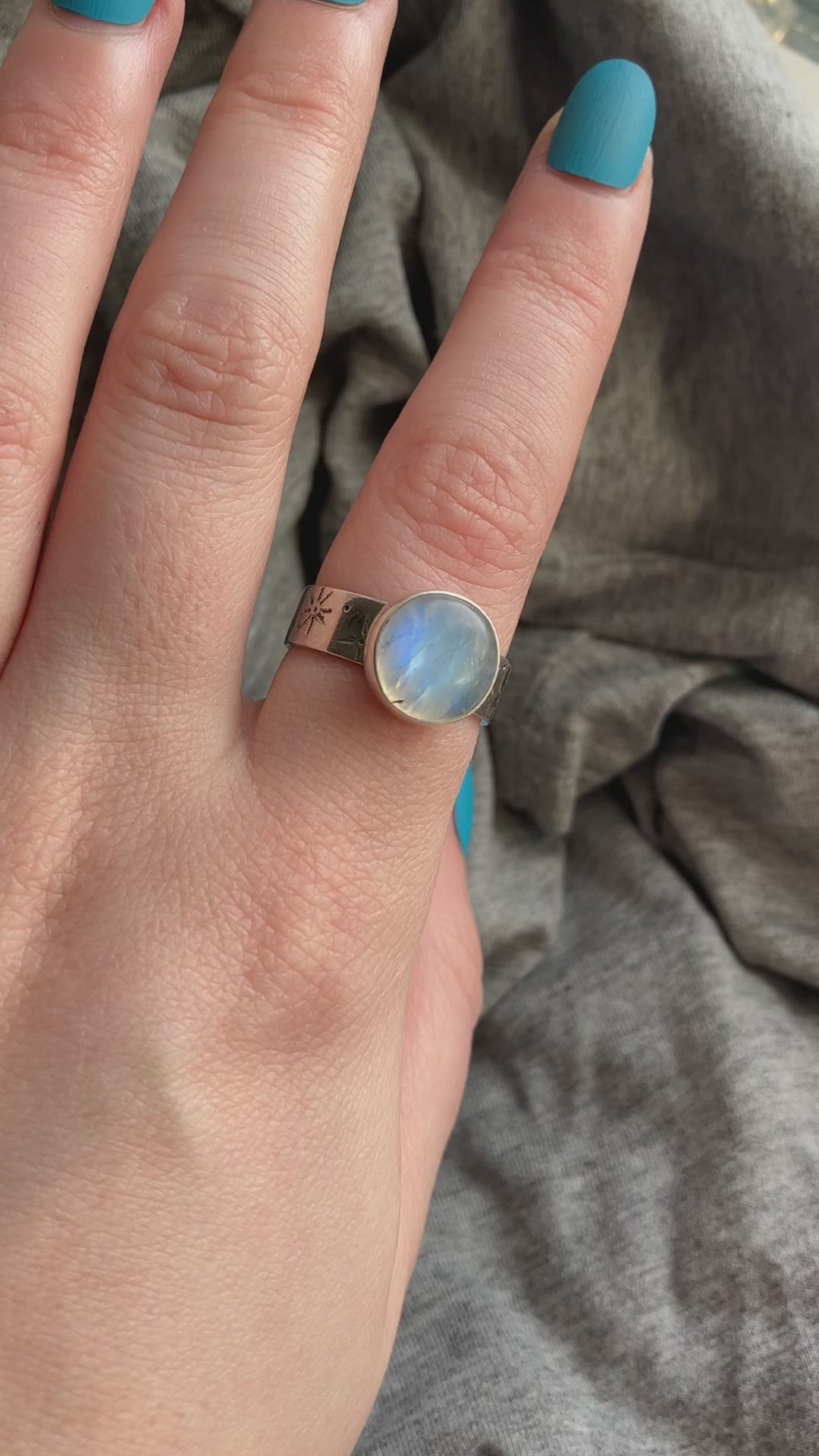 This ring features a Fine Silver bezel set Rainbow Moonstone on a recycled Sterling Silver ring band with a starry pattern.