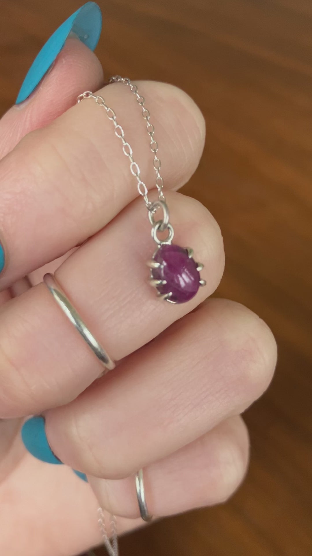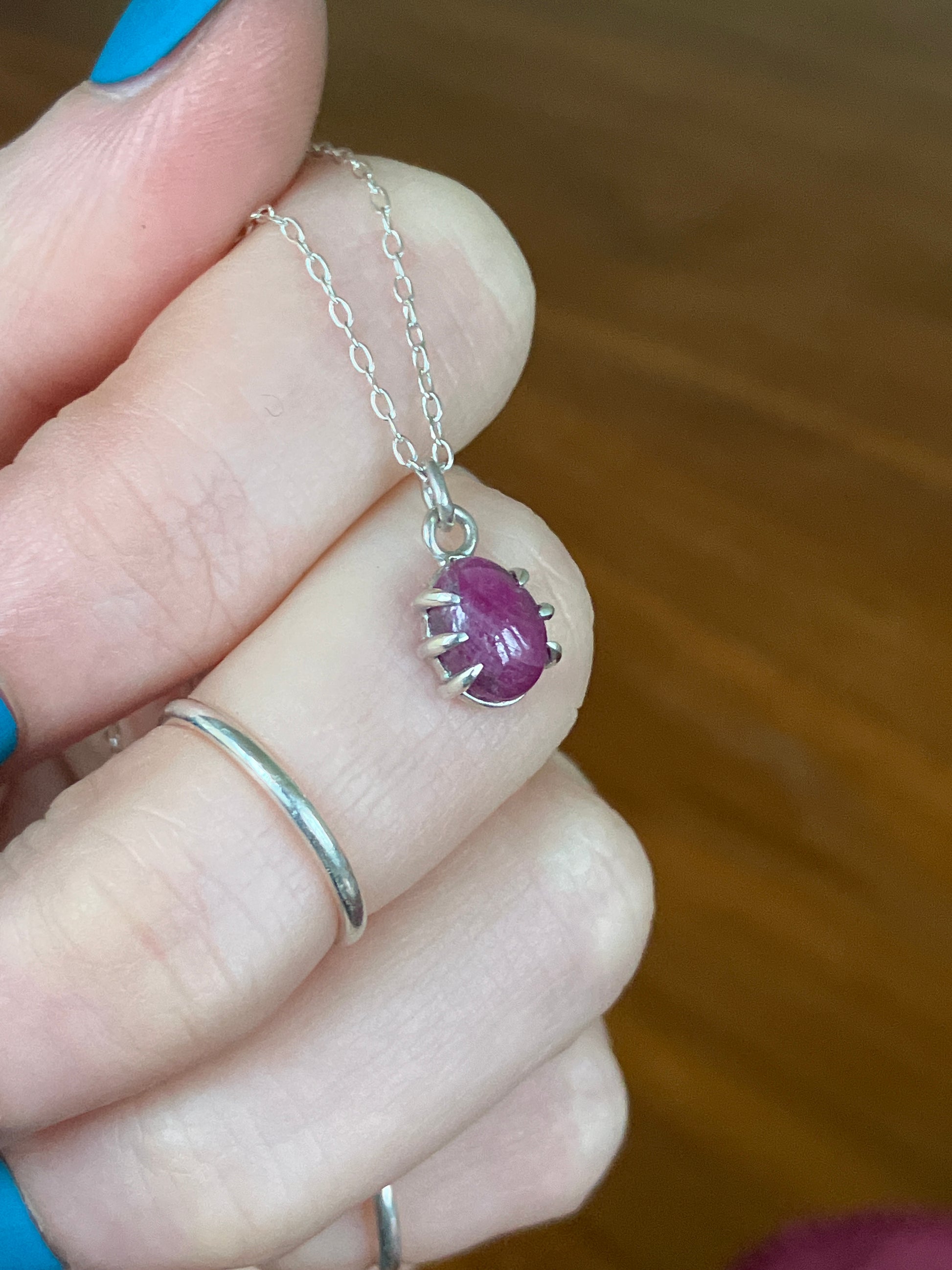 This necklace features a Sterling Silver claw set Ruby on a 45cm Sterling Silver chain as shown in the photos.