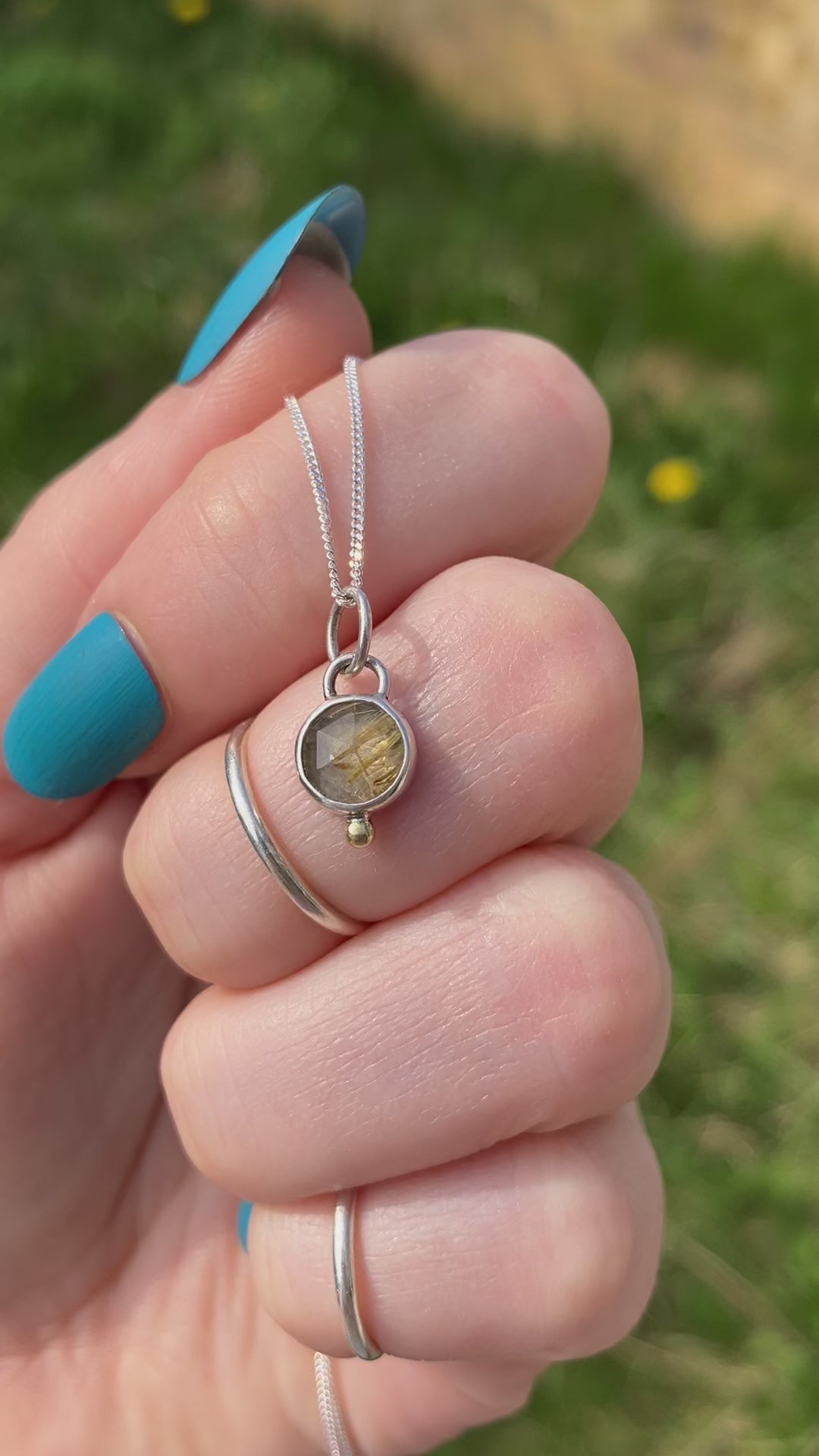 This pendant features a Fine Silver bezel set Rutilated Quartz on a 45cm/18inch Sterling Silver chain with a 18ct Gold granule detail.