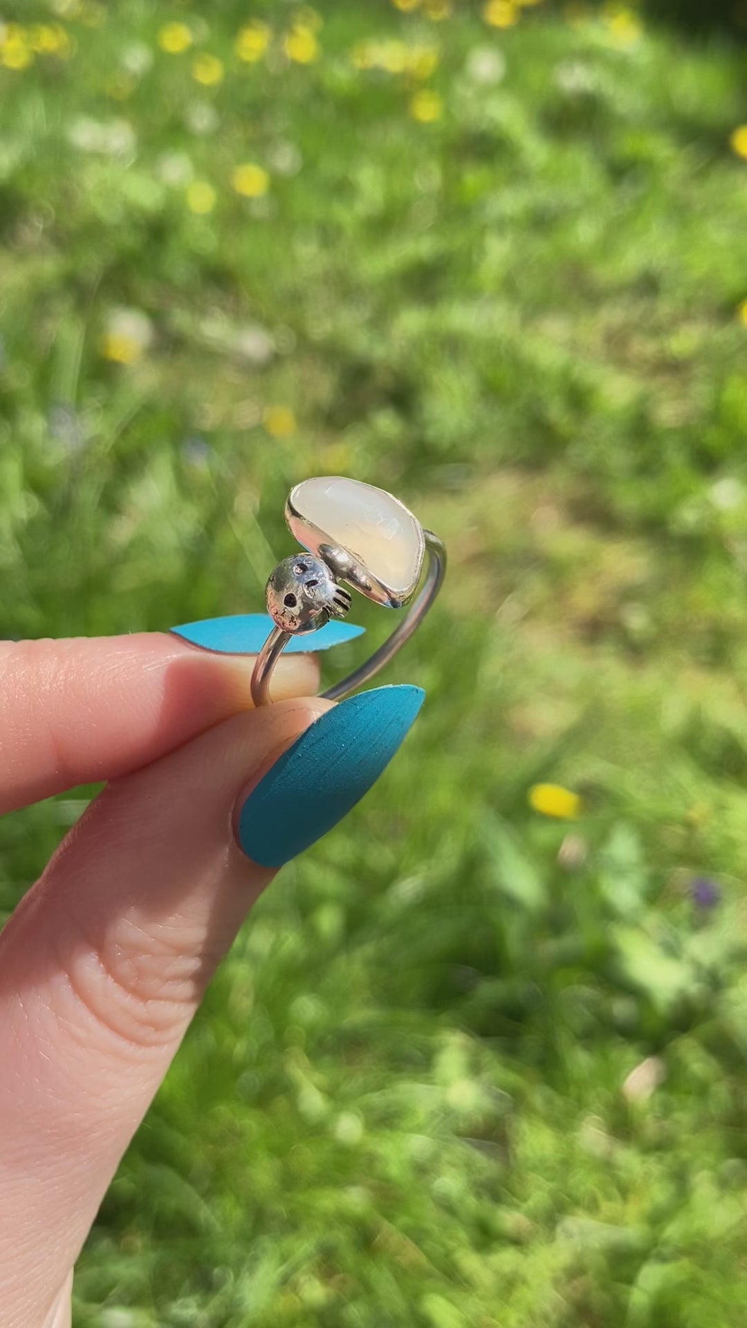This ring features a Fine Silver bezel set White Moonstone with a Sterling Silver skull on a Sterling Silver band.